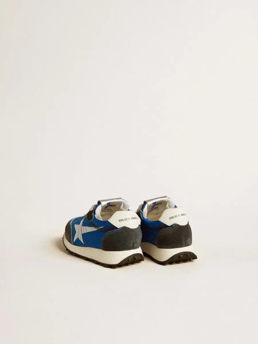 Inspiradas en el atletismo, con un toque setentero. Nuestras nuevas zapatillas Marathon están diseñadas para que puedas perseguir tus sueños día tras día, rindiendo homenaje a la maratón que es la vida. En nailon azul China acentuado con inserciones de ante negro, la versión Young de este modelo presenta una estrella estampada en blanco y una lengüeta de cuero blanco en el talón. El look se completa con cordones blancos y una suela con estrellas que causan una impresión verdaderamente única.