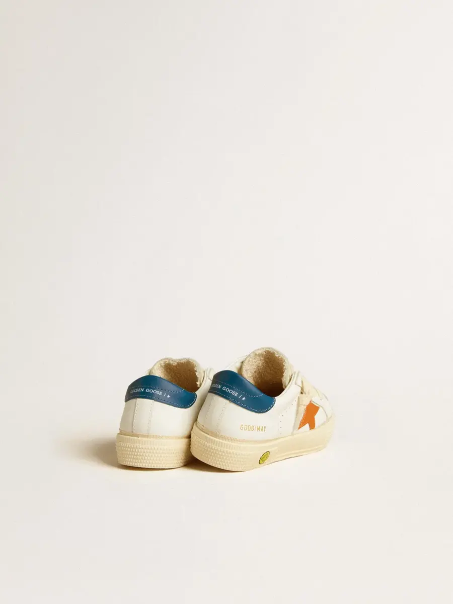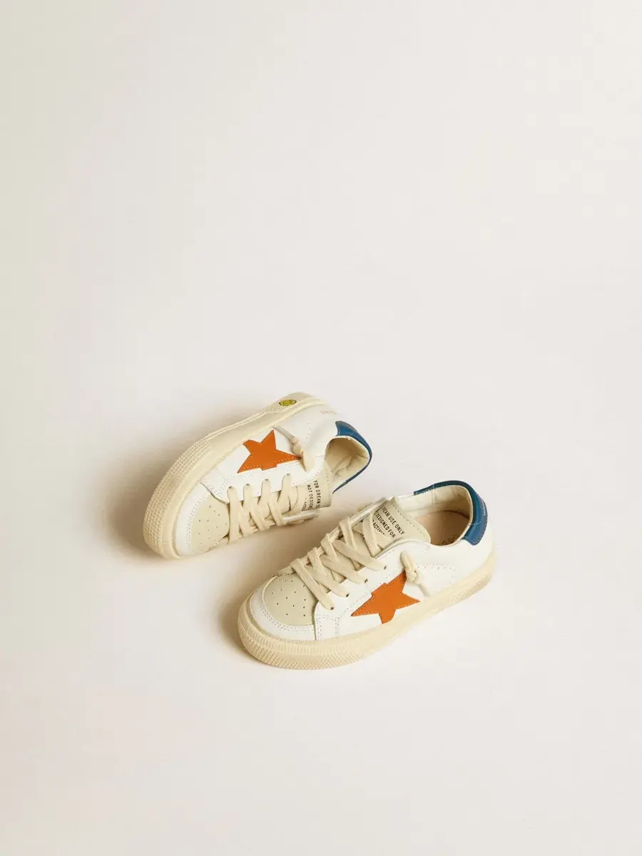 La inspiración de los años setenta y el estilo vintage se unen a la artesanía típica de nuestras zapatillas. Con una parte superior de piel blanca y nubuck, esta versión Teen de las zapatillas May destaca por una estrella de piel naranja y una lengüeta azul en el talón. El detalle contrastante del smiley en el ribete y los cordones de color crema añaden el toque final.