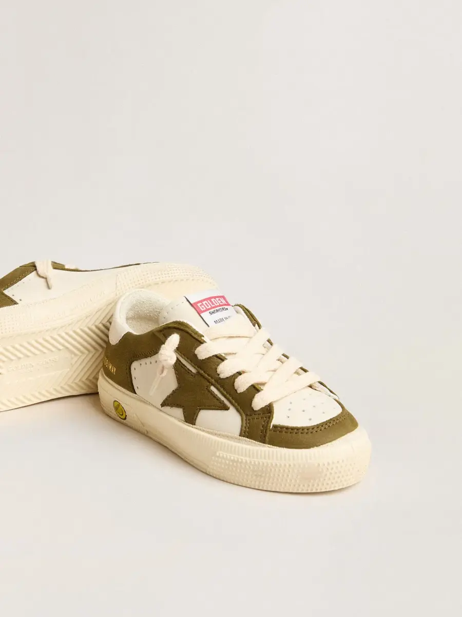 La inspiración de los años setenta y el estilo vintage se unen a la artesanía típica de nuestras zapatillas. Esta versión Young de nuestras zapatillas May presenta una parte superior de cuero blanco y verde militar en contraste. El detalle del smiley en el ribete y los cordones blancos completan el look.