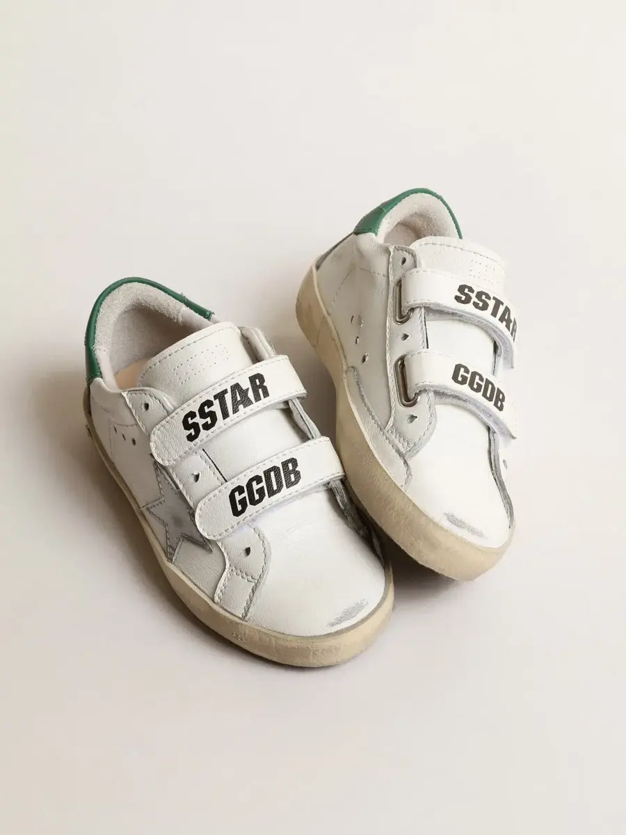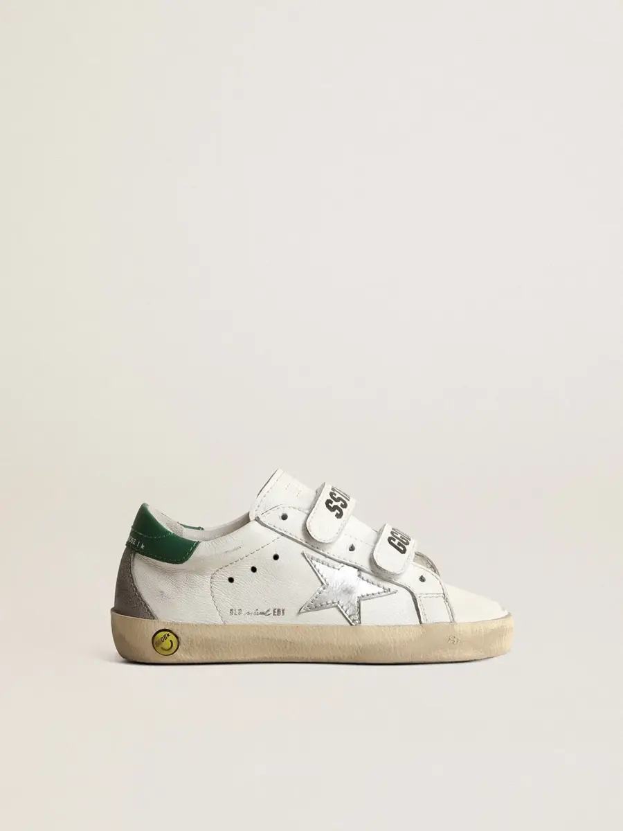 Nuestras zapatillas Old School cuentan con dos tiras de velcro en la parte delantera con el logotipo en contraste. La versión Young de este modelo en piel napa blanca cuenta con una estrella de piel metalizada plateada y una lengüeta verde en el talón. La inserción de ante gris en la parte trasera y el detalle de la sonrisa en el ribete completan el look.