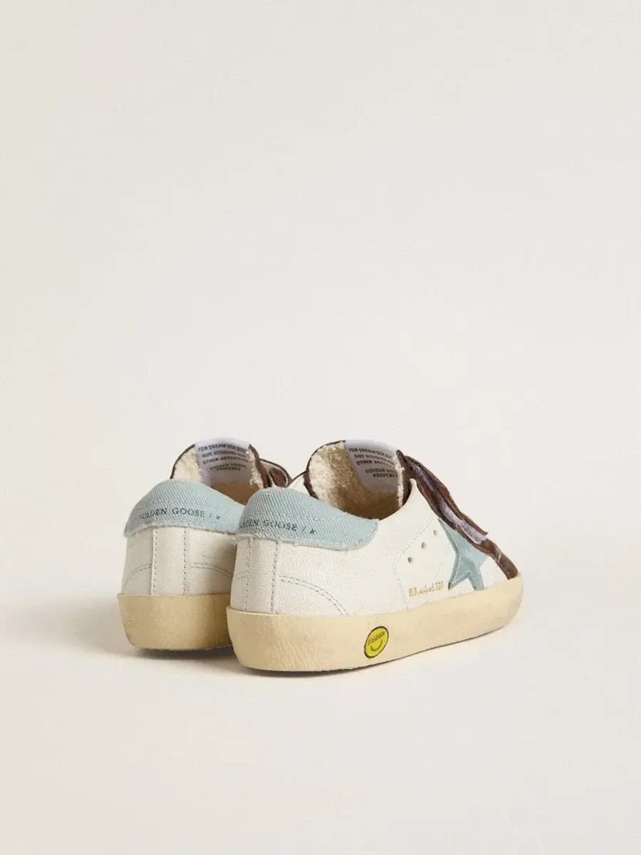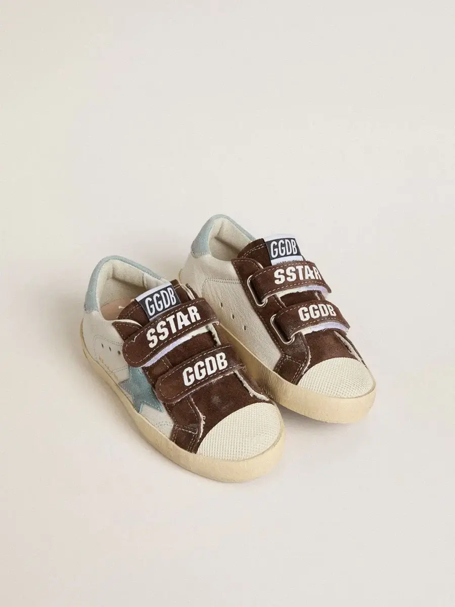 Nuestras zapatillas Old School cuentan con dos tiras de velcro en la parte delantera con el logotipo en contraste. Con una parte superior de piel napa blanca, la versión Young de este modelo cuenta con una estrella de ante azul claro, una lengüeta de lona azul claro en el talón e inserciones de ante marrón. El detalle contrastante del smiley en el ribete y la puntera de goma beige añaden el toque final.