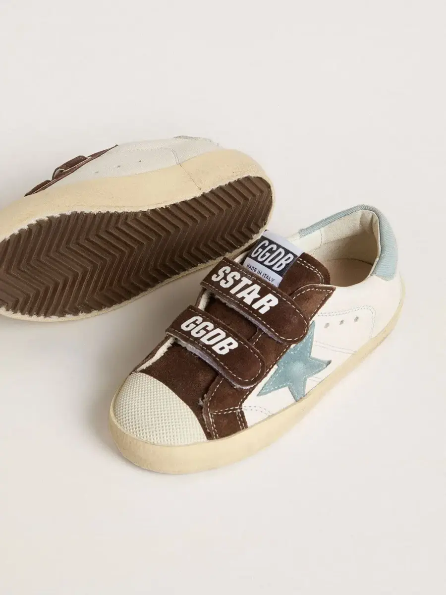 Nuestras zapatillas Old School cuentan con dos tiras de velcro en la parte delantera con un logotipo en contraste. Con una parte superior de piel napa blanca, la versión Teen de este modelo cuenta con una estrella de ante azul claro, una lengüeta de lona azul claro en el talón e inserciones de ante marrón. El detalle contrastante de la sonrisa en el ribete y la puntera de goma beige añaden el toque final.
