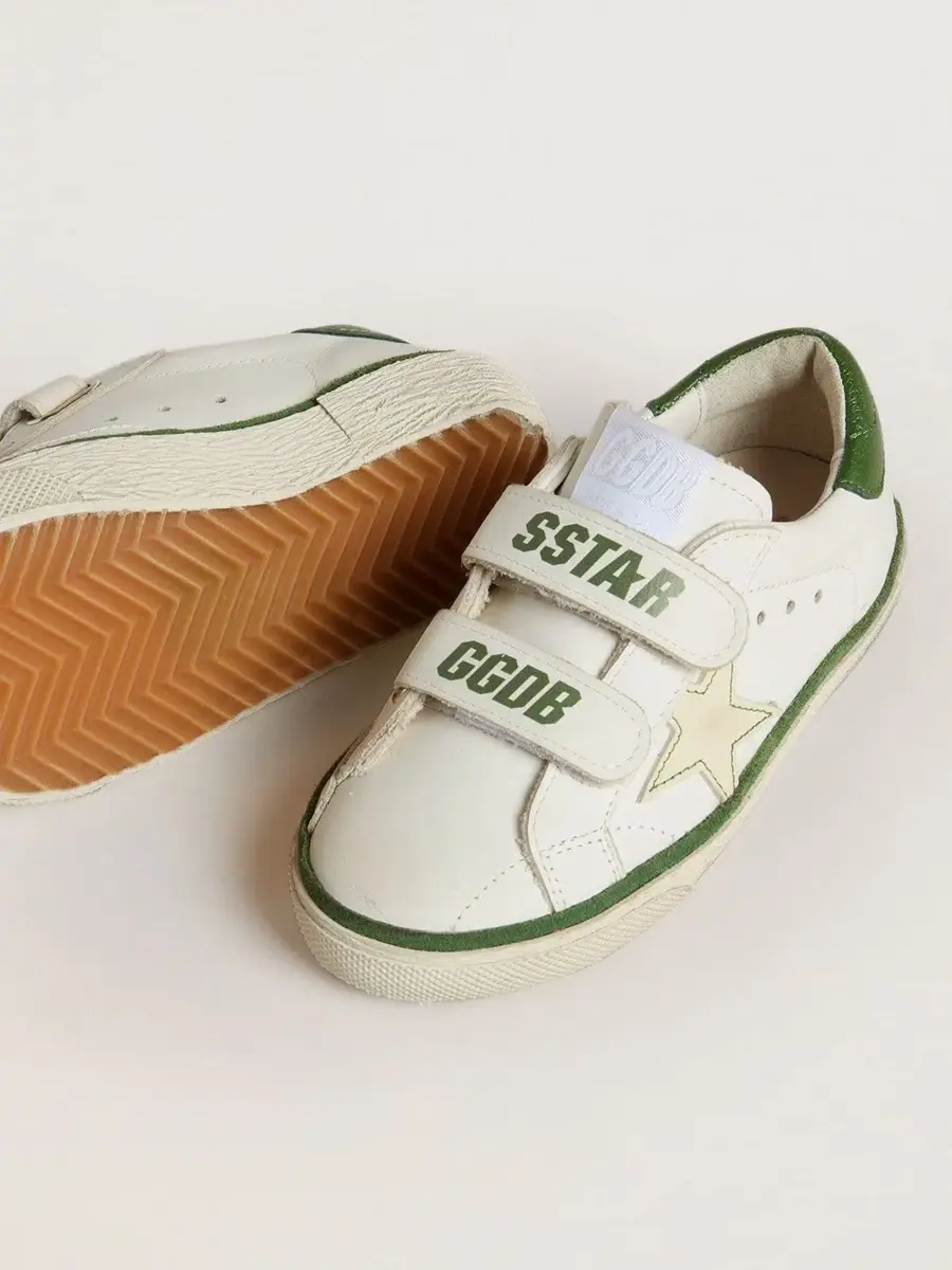 Nuestras zapatillas Old School cuentan con dos tiras de velcro en la parte delantera con el logotipo en contraste. Con una parte superior de piel blanca, la versión Teen de este modelo cuenta con una estrella de piel color crema con costuras verdes, una lengüeta en el talón de napa verde y una inserción de ante verde. El detalle contrastante del smiley en el ribete le da el toque final.