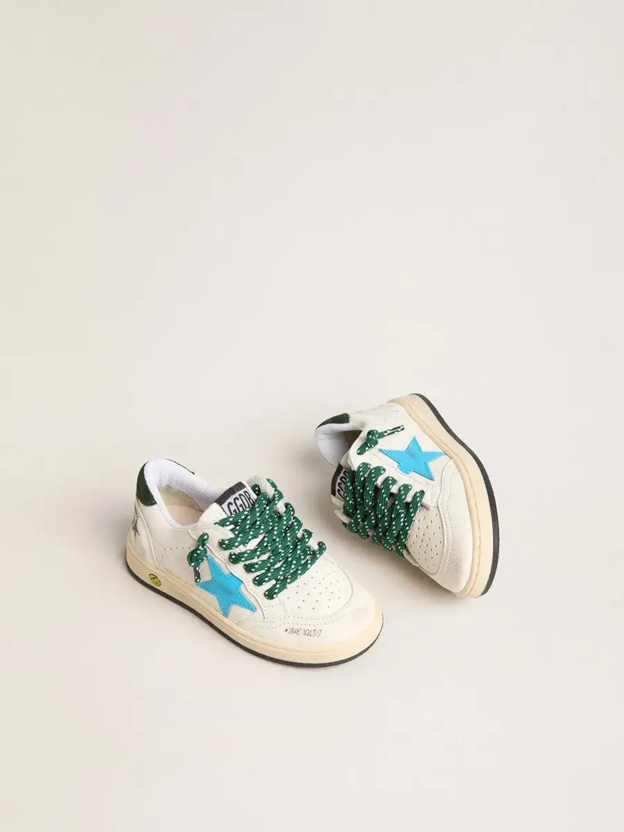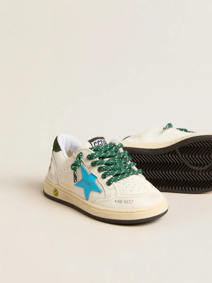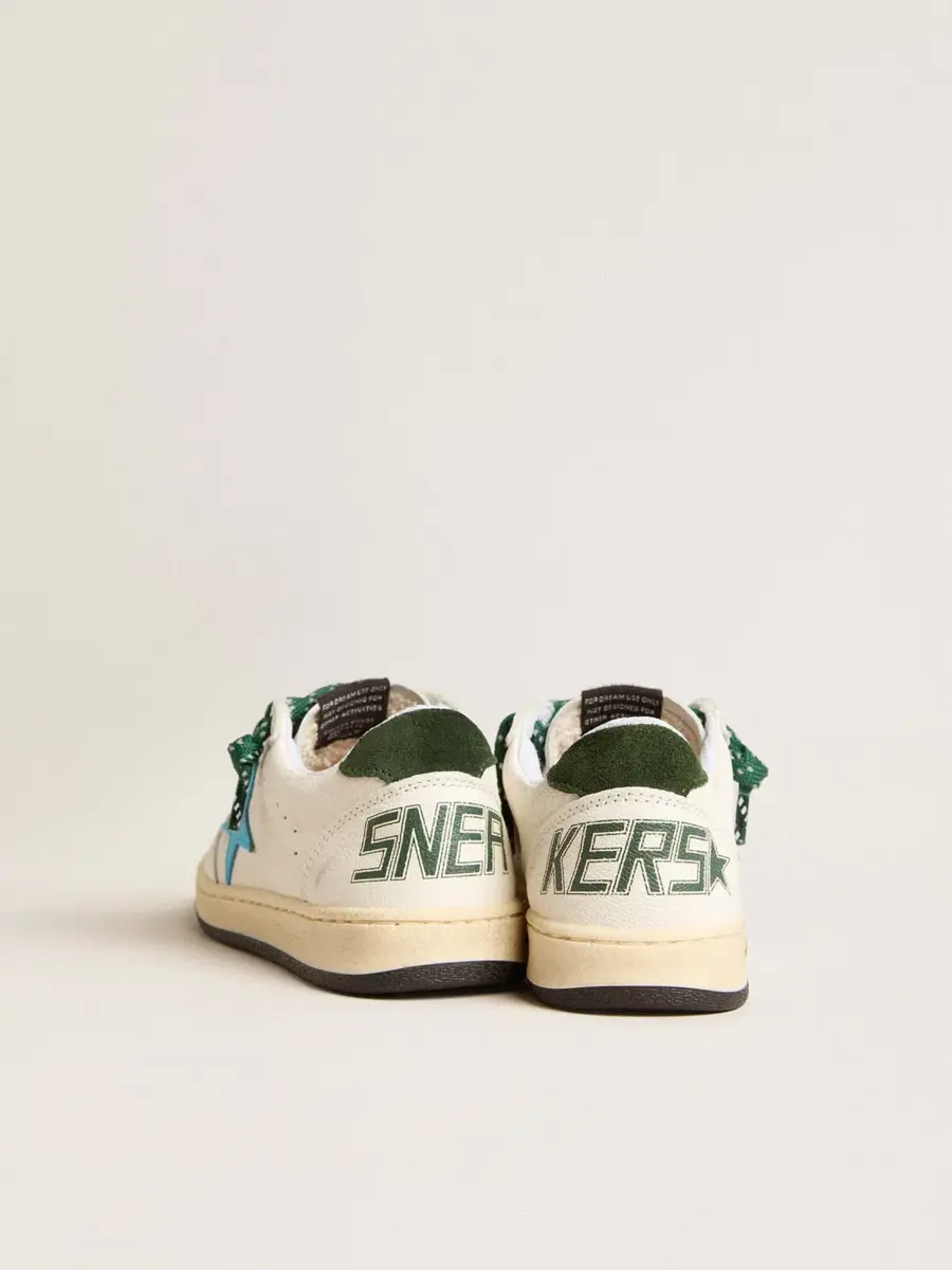 Soñando con los años ochenta. Nuestras zapatillas Ball Star tienen un aire universitario americano, a caballo entre el baloncesto y el skate. Con una parte superior de piel napa blanca, la versión Young de este modelo cuenta con una estrella de piel turquesa y una lengüeta de ante verde oscuro en el talón. El detalle sonriente en el ribete y los cordones verdes de entrenamiento añaden el toque final.