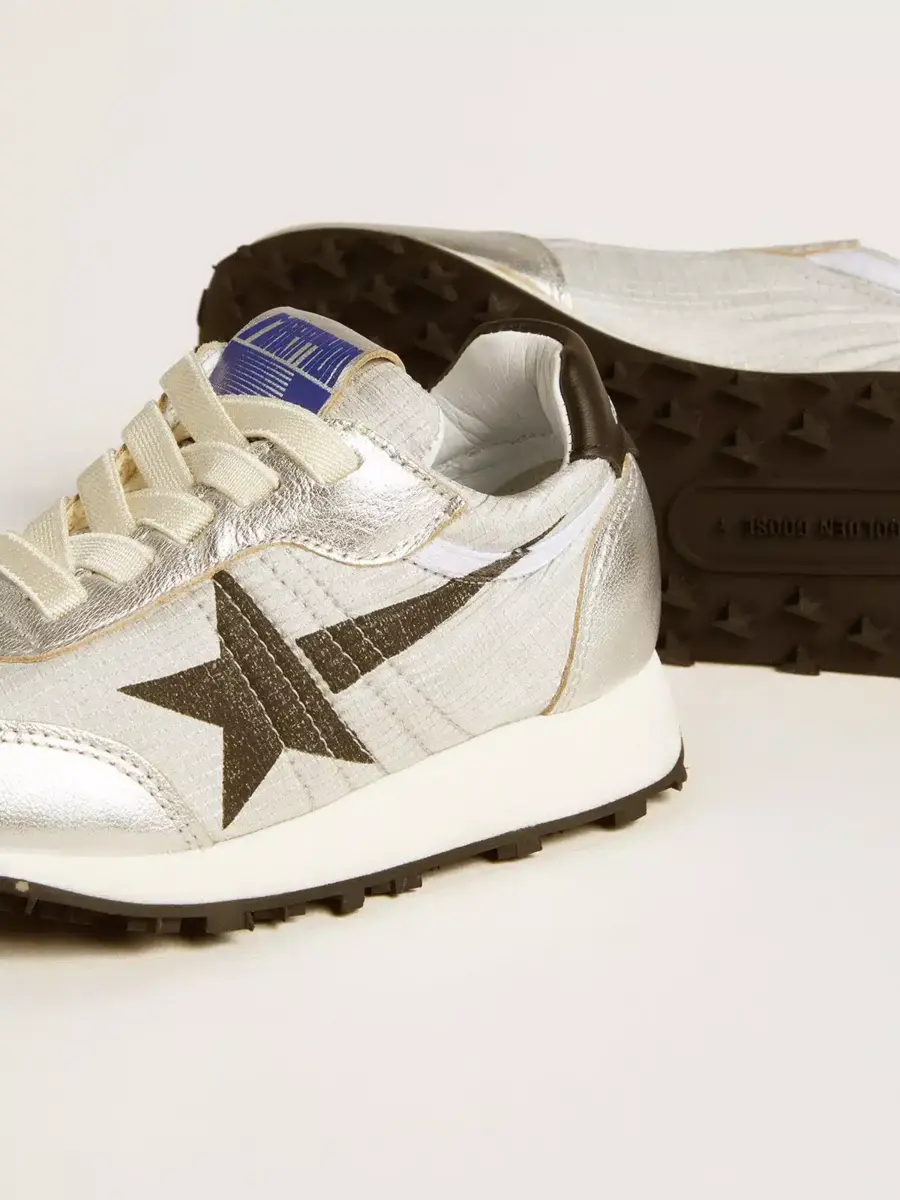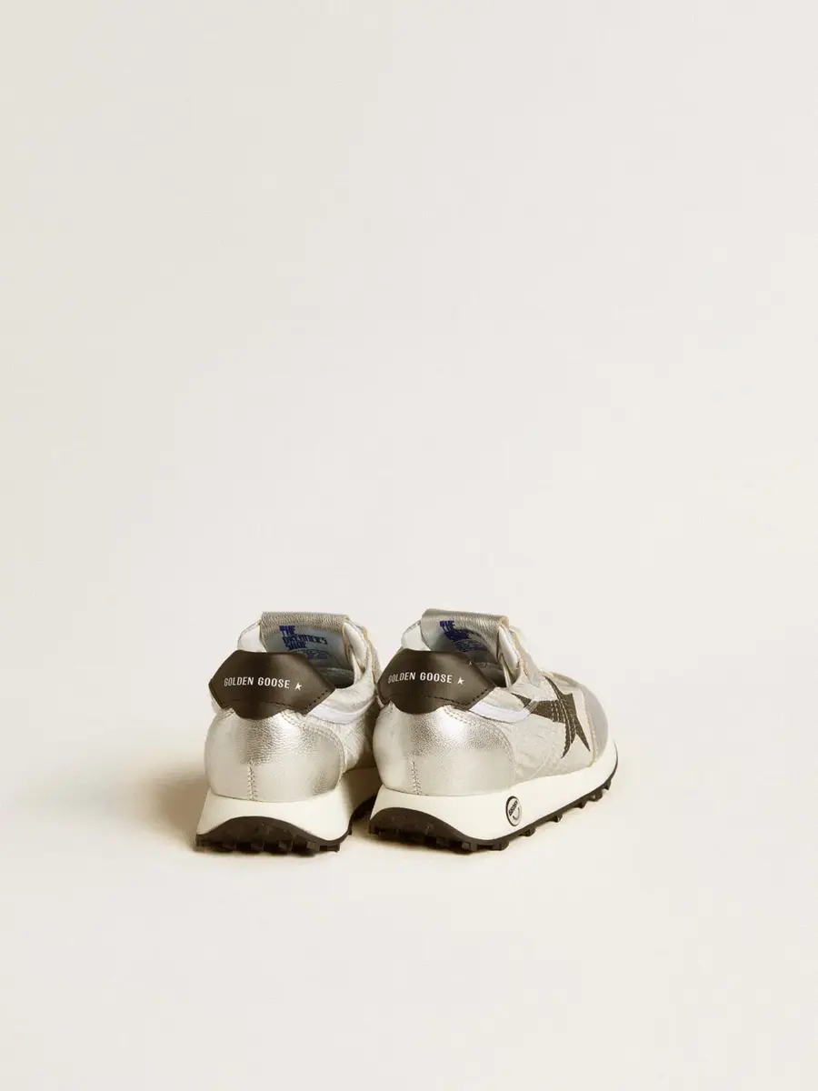 Inspiradas en el atletismo, con un toque setentero. Nuestras nuevas zapatillas Marathon están diseñadas para que puedas perseguir tus sueños día tras día, rindiendo homenaje a la maratón que es la vida. En nailon plateado acentuado por inserciones de cuero plateado metalizado, la versión Young de este modelo presenta una estrella estampada en negro y una lengüeta de cuero negro en el talón. El look se completa con cordones blancos y una suela con estrellas que le dan un toque realmente único.