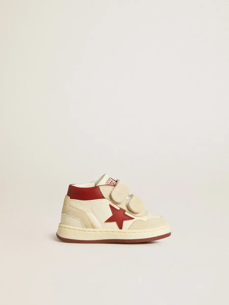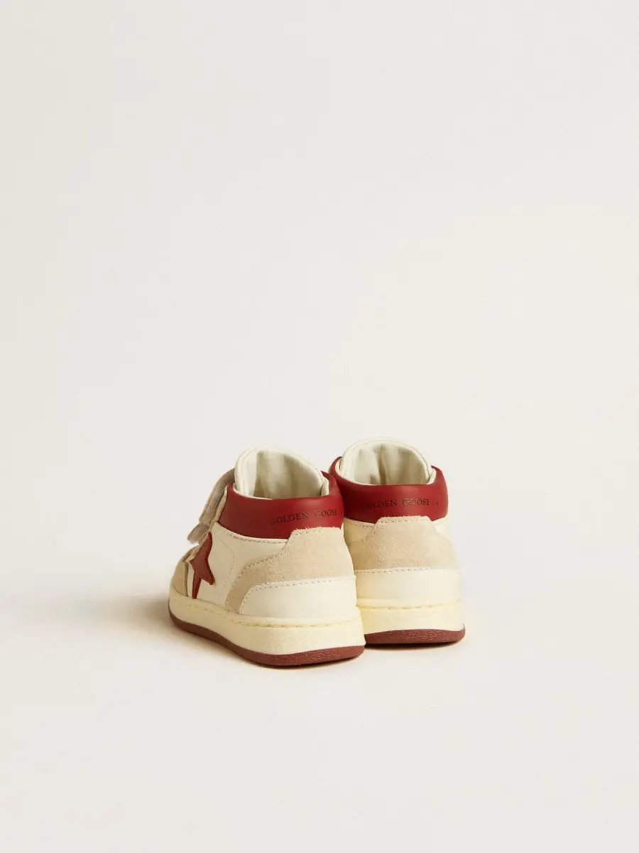 La versión Junior de nuestras zapatillas June cuenta con dos tiras de velcro en la parte delantera. Con una parte superior de napa blanca, este modelo presenta inserciones de cuero rojo, como la estrella y la lengüeta del talón, e inserciones de ante beige. La lengüeta de nailon blanco y piel napa le da el toque final.