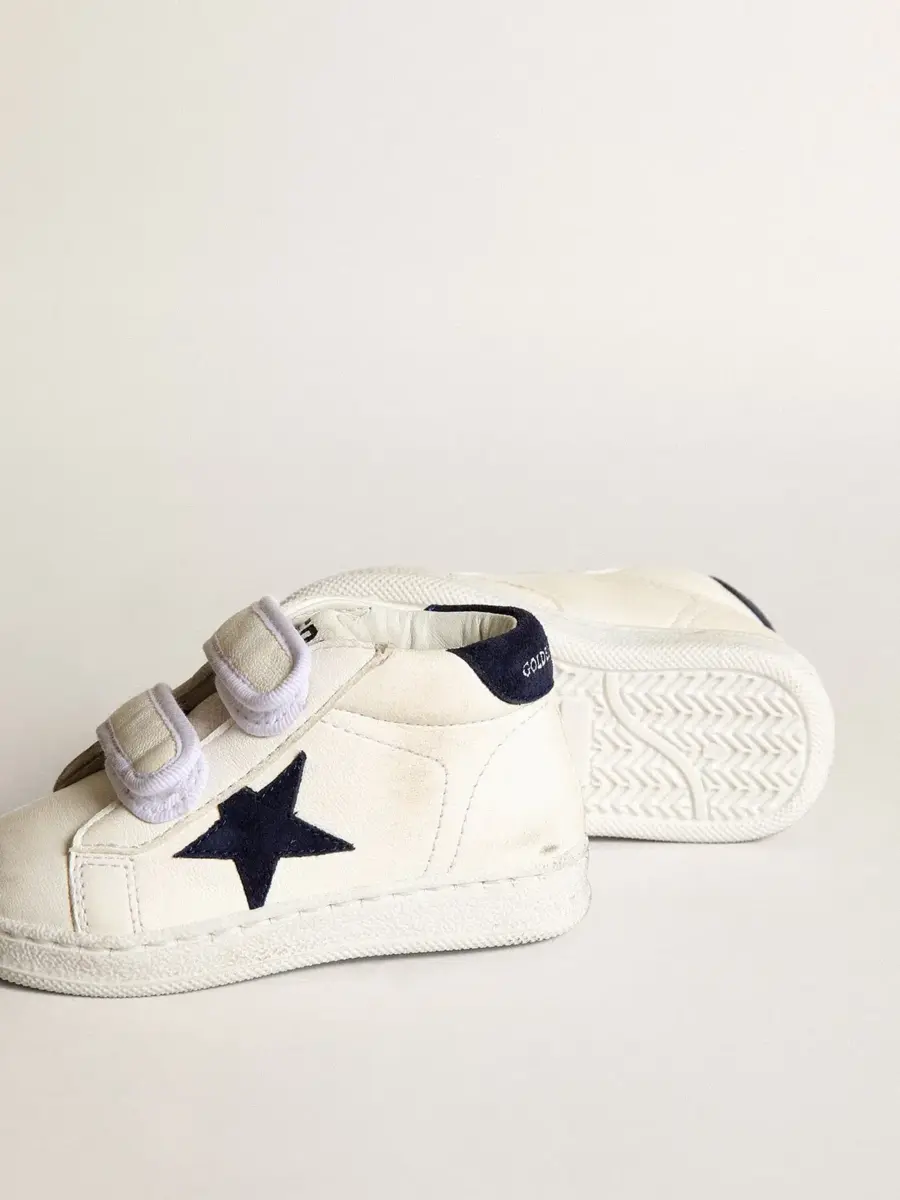 La versión Junior de nuestras zapatillas June cuenta con dos tiras de velcro en la parte delantera. Este modelo con parte superior de piel napa blanca presenta una estrella y una lengüeta en el talón de ante azul oscuro.