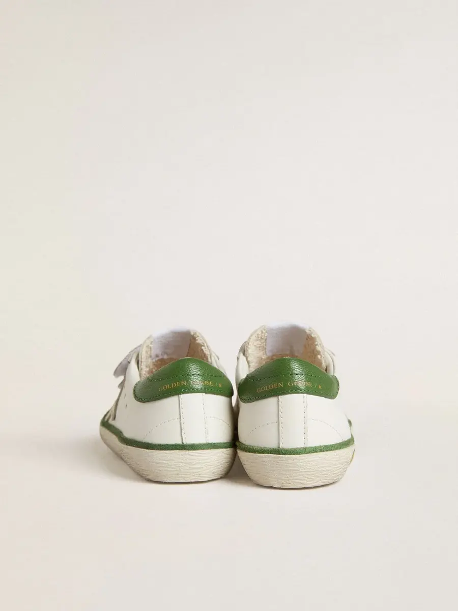 Nuestras zapatillas Old School cuentan con dos tiras de velcro en la parte delantera con el logotipo en contraste. Con una parte superior de piel blanca, la versión Junior de este modelo cuenta con una estrella de piel color crema con costuras verdes, una lengüeta en el talón de piel napa verde y una inserción de ante verde. El detalle contrastante del smiley en el ribete le da el toque final.
