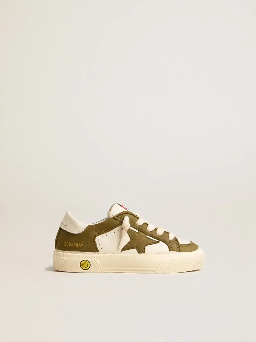 La inspiración de los años setenta y el estilo vintage se unen a la artesanía típica de nuestras zapatillas. Esta versión junior de nuestras zapatillas May presenta una parte superior de piel militar en blanco y verde a juego. El detalle sonriente en el ribete y los cordones blancos completan el look.