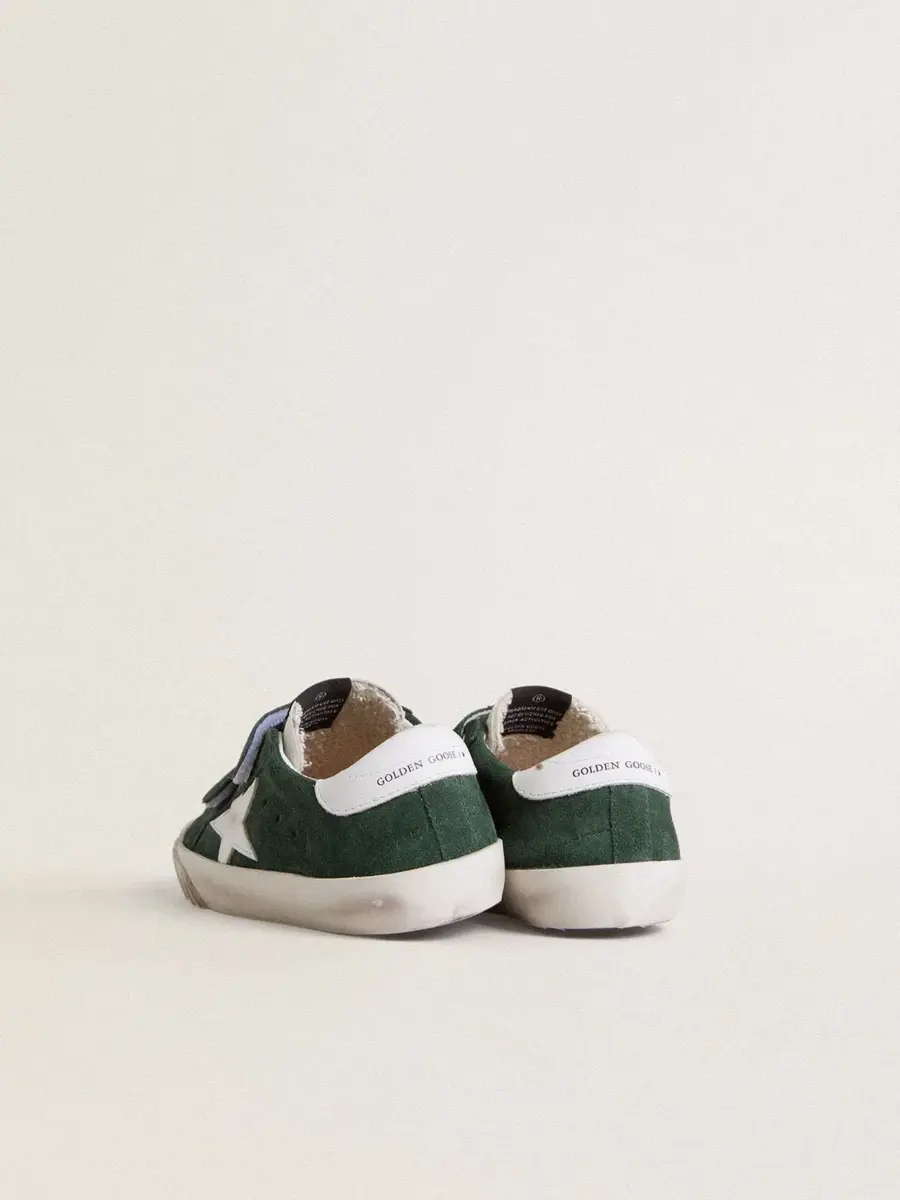 Nuestras zapatillas Old School cuentan con dos tiras de velcro en la parte delantera con el logotipo en contraste. La versión Junior de este modelo en ante verde presenta detalles en piel blanca, como la estrella, la lengüeta del talón y la lengüeta.