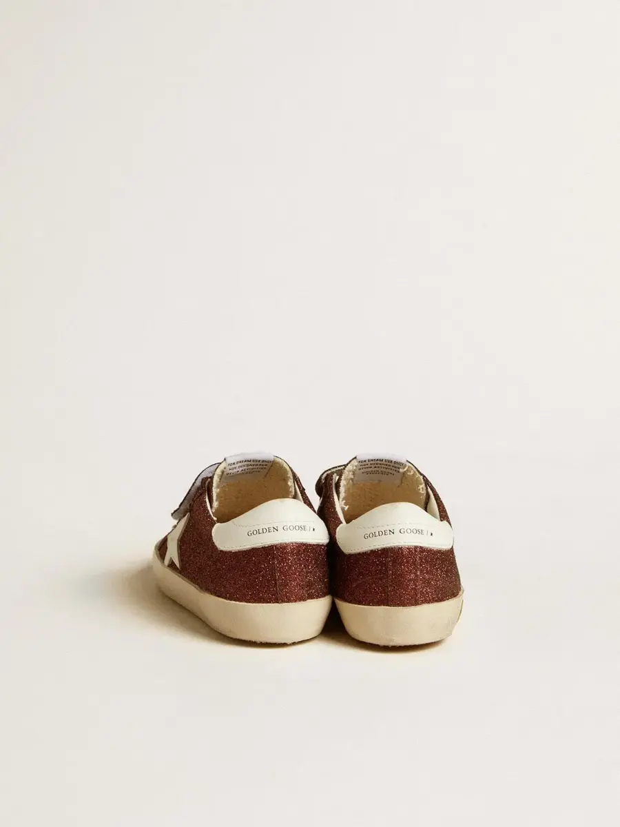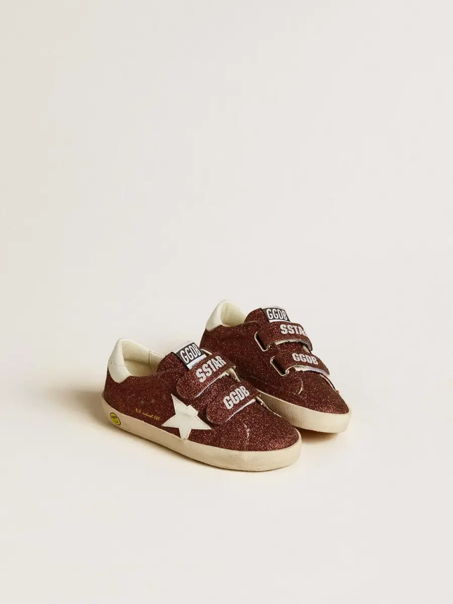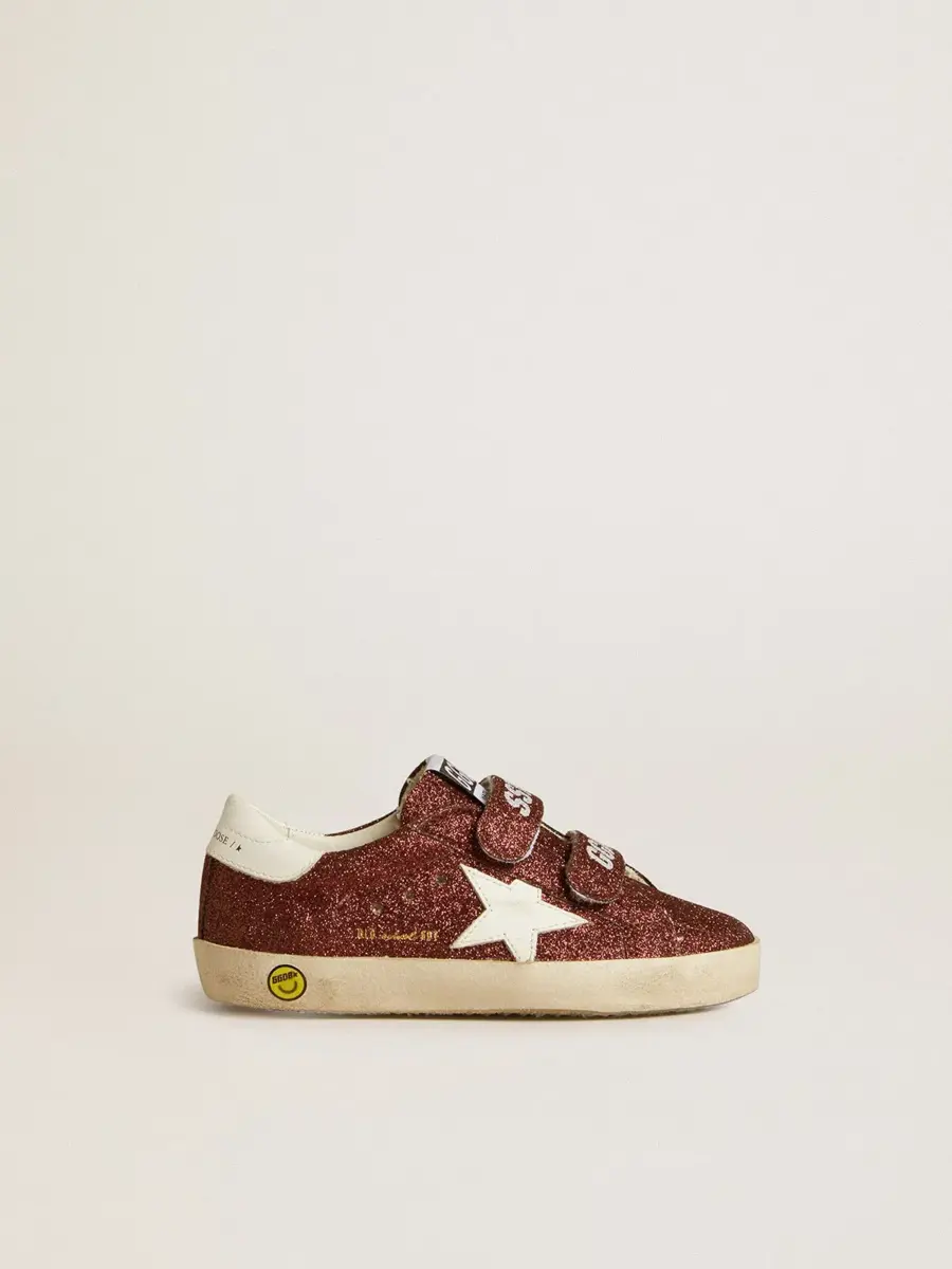 Nuestras zapatillas Old School cuentan con dos tiras de velcro en la parte delantera con un logotipo en contraste. La versión Junior de este modelo en color burdeos brillante cuenta con una estrella de cuero blanco y una lengüeta en el talón.