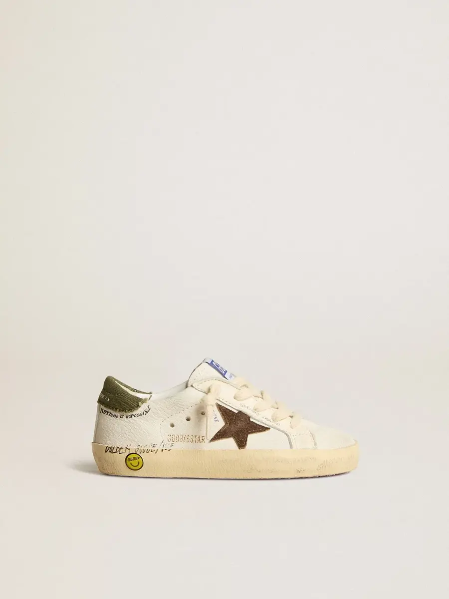 Un icono atemporal que, sin embargo, está en constante evolución. En Golden nos encanta retocar nuestros clásicos constantemente, siempre desde un nuevo ángulo. Con una parte superior de napa blanca con letras en contraste, esta versión Junior de las Super-Star cuenta con una estrella de ante marrón y una lengüeta verde de lona en el talón. El smiley y las letras en contraste en el ribete y los cordones de color crema añaden el toque final.